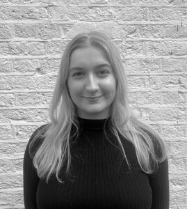Emily Herman, a woman with braided hair wearing a dark button-up shirt, stands smiling in front of a white wall. The image is in black and white.