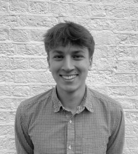 Conor O'Sullivan, a young man with short hair, stands against a light-colored, textured wall in a dark button-up shirt, facing the camera with a slight smile. The black and white image highlights his relaxed demeanor.